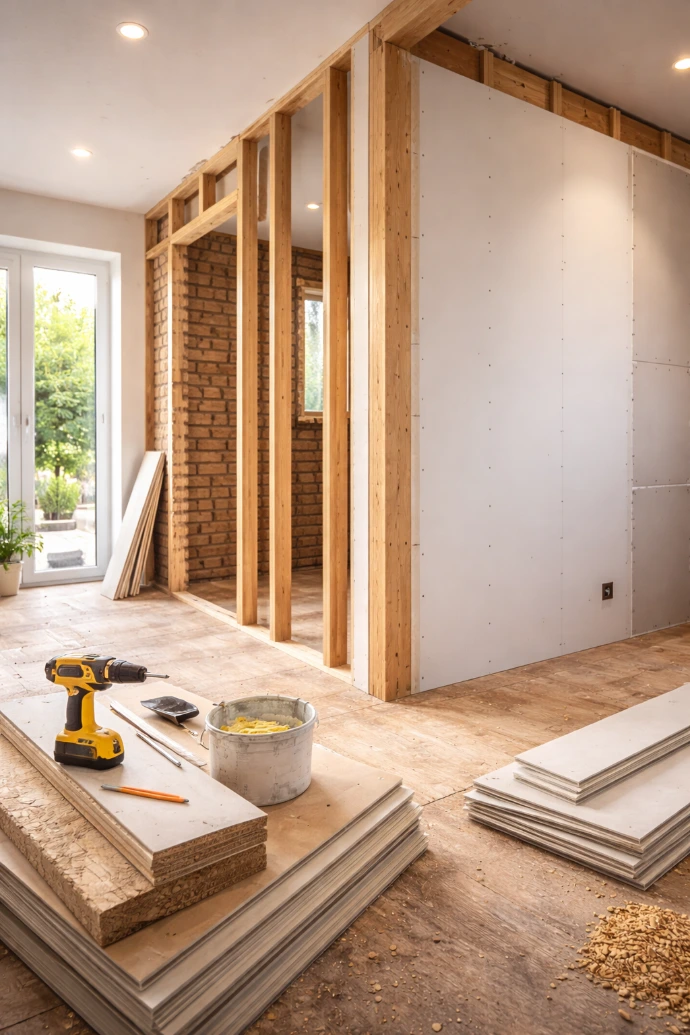 Travaux de rénovation pour moderniser et améliorer votre logement : reprise de parois, cloisons, planchers et optimisation des espaces existants. Chaque projet est pensé sur-mesure, dans le respect du bâti.