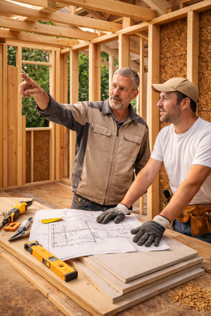 Coaching et accompagnement de projets en ossature bois pour les particuliers souhaitant comprendre, préparer et faire leur chantier avec le suivi d'un professionnel.